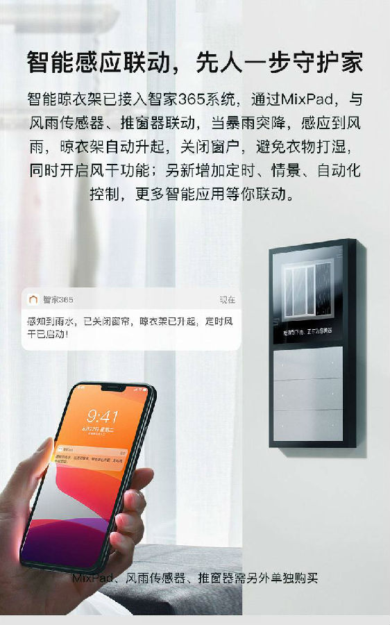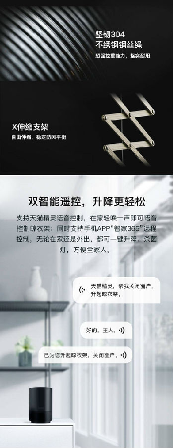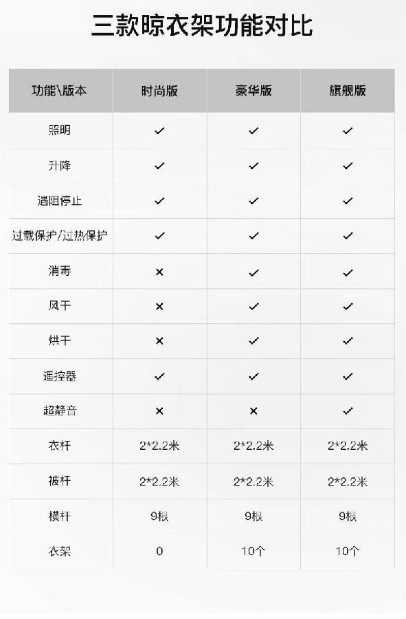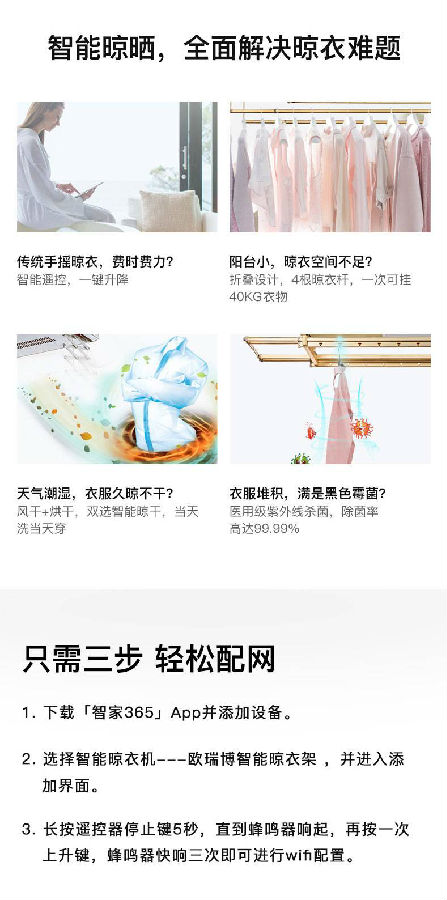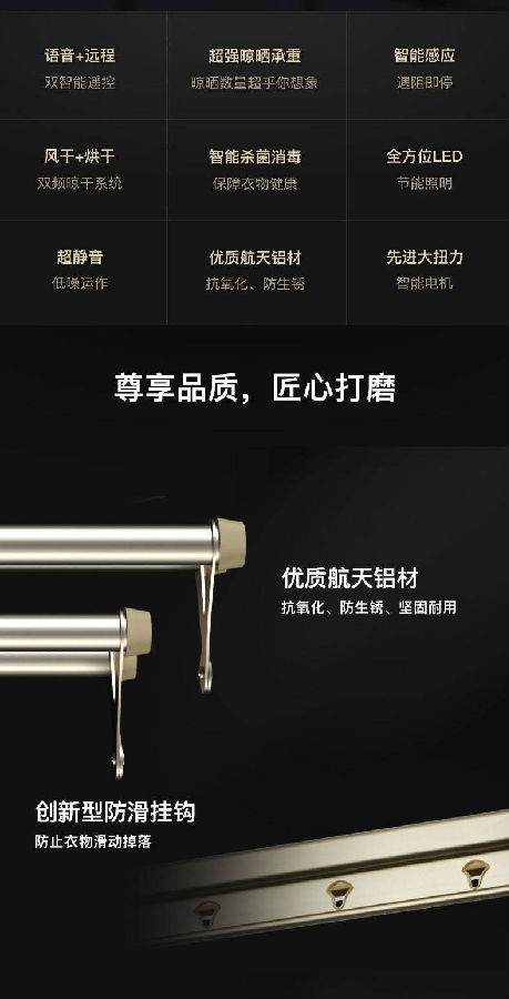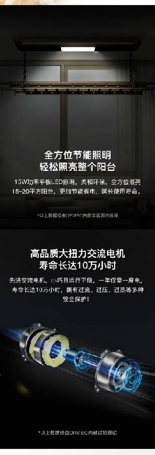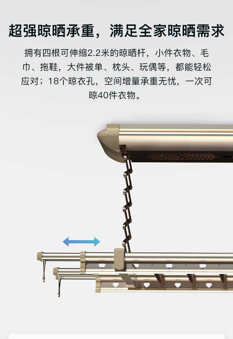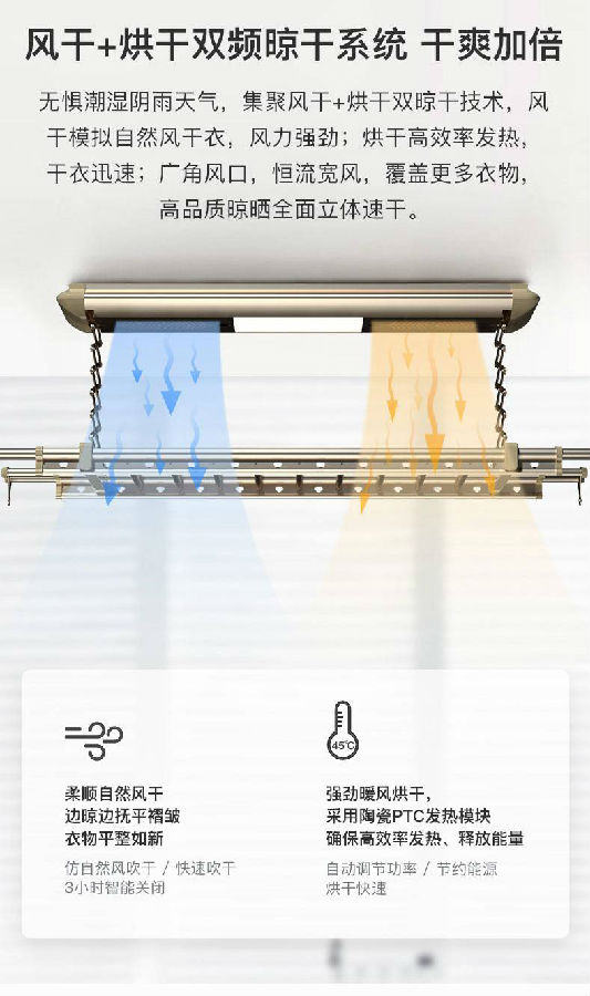 轻松解决所有晾衣难题,可实现智能遥控升降、智能杀菌、自然风干、恒温烘干等健康高效功能,实用又耐用。(时尚版无消毒烘干功能)